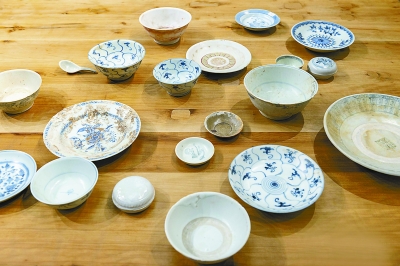 捐赠现场,国博专门摆放了长条案,展示这些海上丝绸之路的遗存。一个青花瓷盘上,寥寥几笔勾勒出生动的花卉图案,海水侵蚀留下的痕迹斑斑点点。还有一些文物已经过简单清洁修复,恢复光洁的外表。