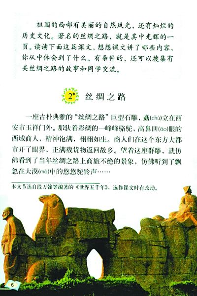 “一座古朴典雅的‘丝绸之路’巨型石雕,矗立在西安市玉祥门外。那驮着彩绸的一峰峰骆驼,高鼻凹眼的西域商人,精神饱满,栩栩如生。商人们在这个东方大都市开了眼界,正满载货物返回故乡。望着这座群雕,就仿佛看到了当年丝绸之路上商旅不绝的景象,仿佛听到了飘忽在大漠中的悠悠驼铃声……”(《丝绸之路》,人教版五年级语文下册)