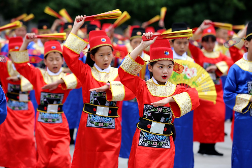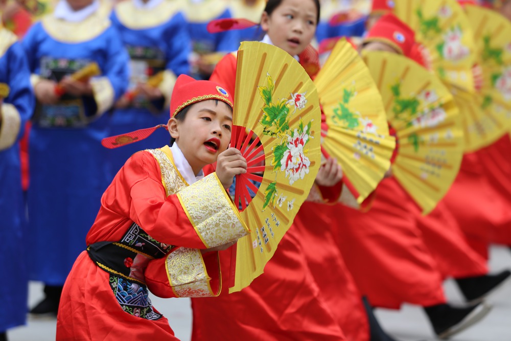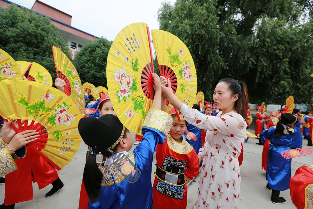 “为救李郎离家园,谁料皇榜中状元,中状元着红袍,帽插宫花好新鲜……” 6月23日上午,在湖北省竹山县得胜镇小学校园里,悠扬婉转的黄梅调萦绕耳畔,虽稚嫩却别有一番韵味,该校520名小学生正用心表演和感受着黄梅戏这一传统文化的魅力,小戏迷们的一招一式,充满戏曲韵味。手、眼、身、步配合协调,时而可爱、时而大方、时而柔情、时而爽朗,唱念做打,有模有样。